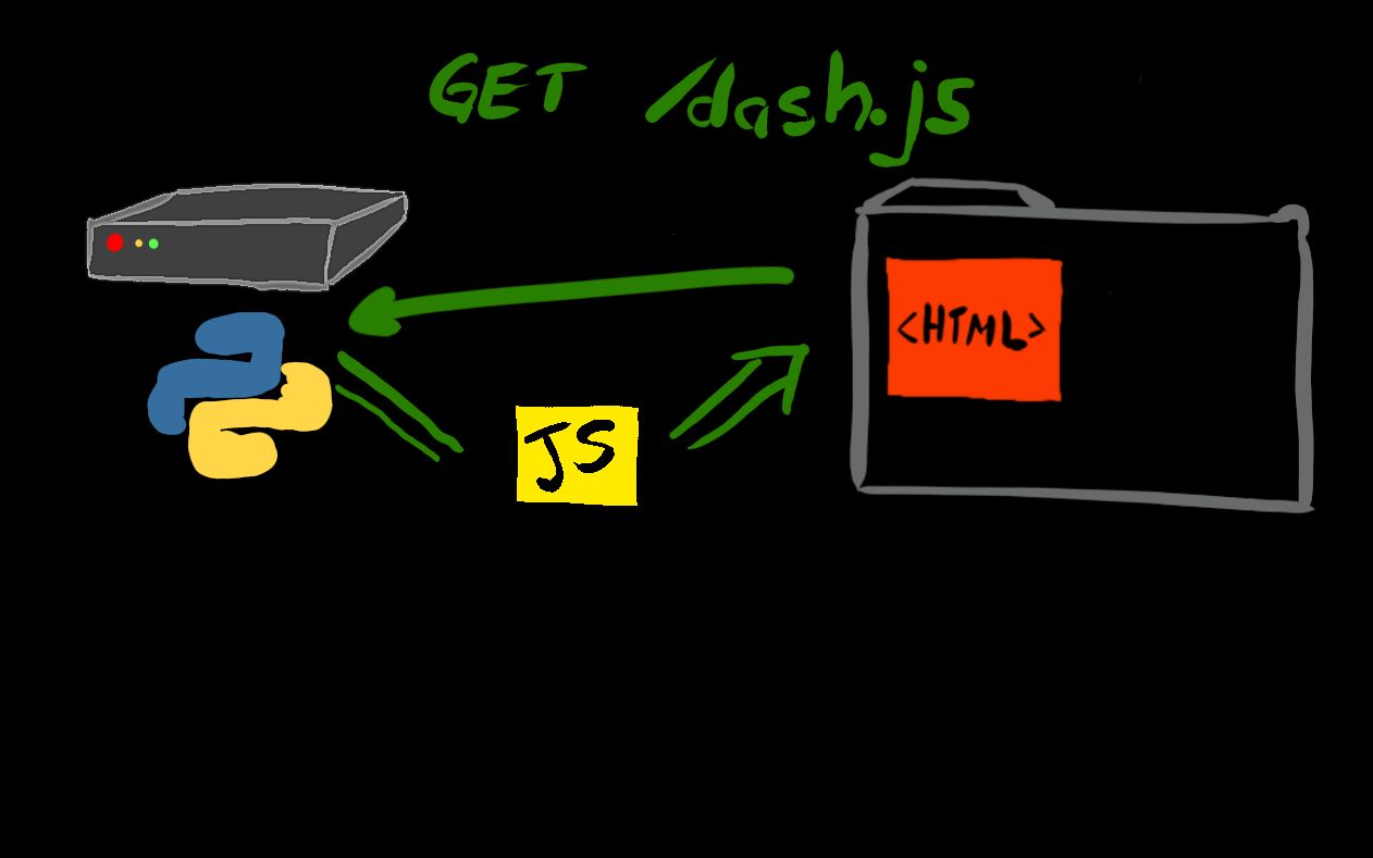The HTML page likely includes references to additional assets such as CSS, JavaScript and static assets like images and favicons. In the context of Plotly Dash, the page includes a script tag which is used as the entry point for Dash's front-end: Dash Renderer. The browser makes a GET request to retrieve the JavaScript file containing Dash Renderer:
